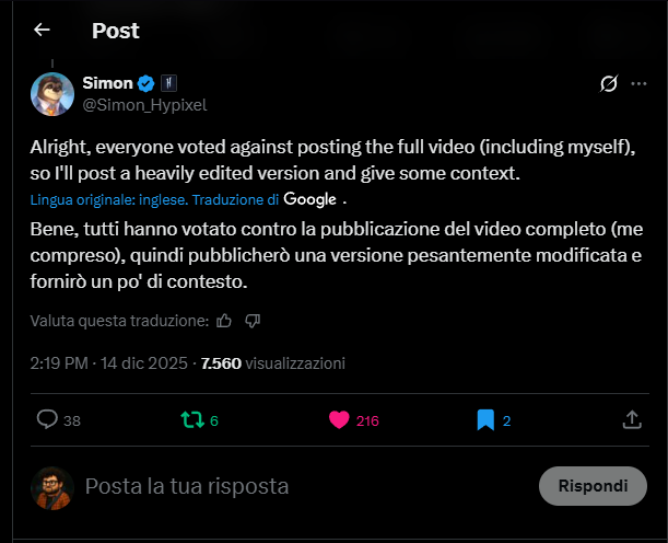 Abbiamo già la prima persona del pubblico che ha pre-acquistato HYTALE, lui ha scelto la Cursebreaker edition voi quale edizione sceglierete oggi alle 16:00 ore italiane? Fonte: Tweet di AntVenom: https://x.com/AntVenom/status/1999664402908483747 https://x.com/AntVenom/status/1999675215354486999 https://x.com/AntVenom/status/1999669870309654539 Tweet di Commento di Simon_Hypixel : https://x.com/Simon_Hypixel/status/1999674447150895230A